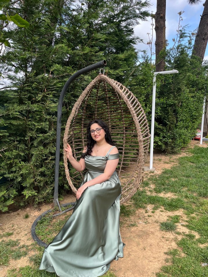 haki taş askılı drapeli, askılı kollara sahip uzun, bol kesim abiye elbisedir. Sadece 3 saat giyilmiştir.