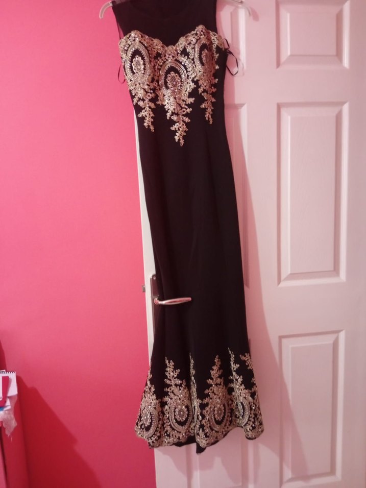 koyu renkte, straplez ve kolsuz, işlemeli dantel detaylı, uzun ve vücuda oturan abiye elbise. Gotik tarzda, düğünler için uygun şık bir model. 36 beden kapandıgım için satıyorum