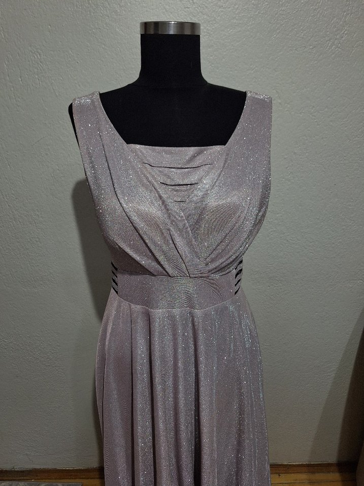 Kadınlar için V yakalı, askılı ve uzun simli toz pembe abiye elbise. Düğün ve özel davetler için şık ve ışıltılı bir model. ✨ Bir kez giyildi. Önünde drapeli dekolte sonradan eklenmiştir çıkartılabilir. Bel detayı transparandır.