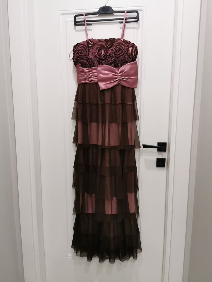 ince askılı, kat kat fırfırlı ve baskılı desenli, beli büyük fiyonk detaylı dar kesim uzun abiye elbise.