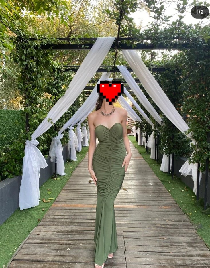 Hafif haki renkte, straplez yakalı ve drapeli detaylara sahip, uzun ve vücuda oturan abiye elbise. İnce askılı kollarıyla avant-garde stilinde, düğünler için uygun.Marka temsilidir.