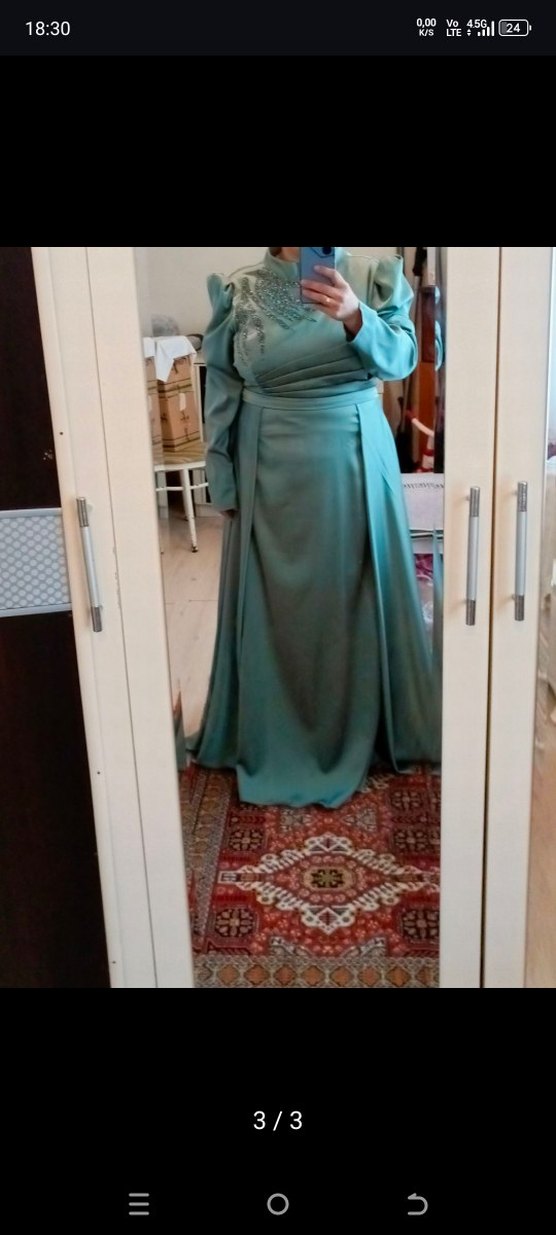 yeşil renkli, uzun kollu ve drapeli tarzda uzun abiye elbise. bisiklet yakalı ve düzenli kesimlidir. Düğünler için uygundur.