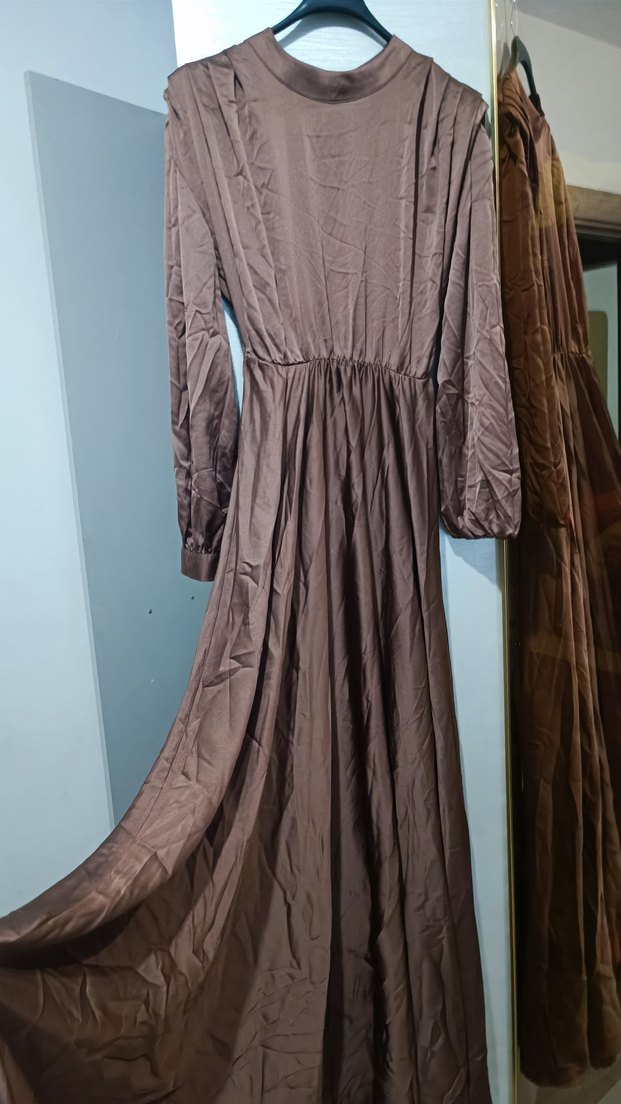 kırışıklık olduğu için saten görüntü tam velli değil acı kahve rengi iki kez giyildi 40 beden Uzun, bej renkte V yaka ve uzun kollu, bol kesim kadın elbisesi. İpeksi kumaştan, drapeli ve desensiz tasarımıyla vintage bohem tarzını yansıtıyor.