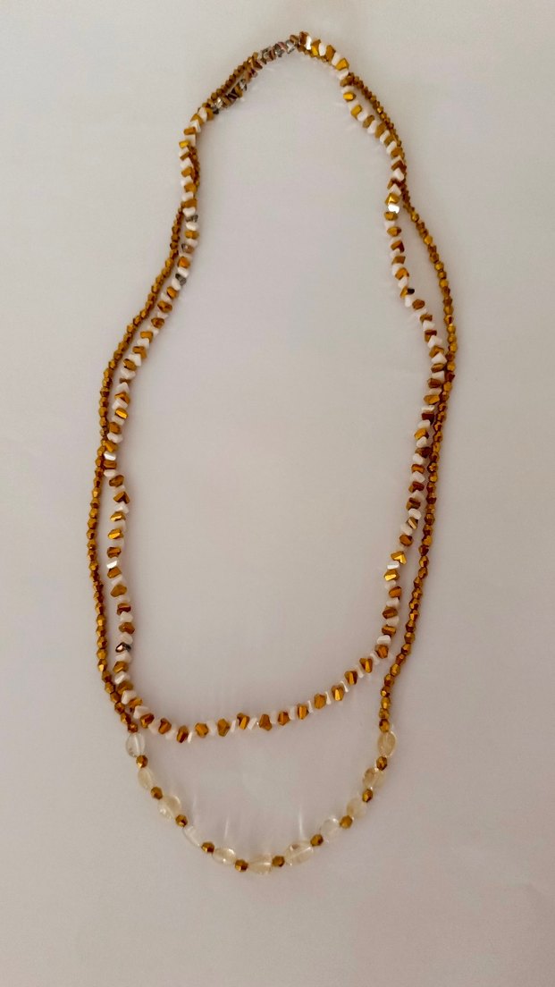 Uzun boyda, parlak altın renkte boncuklu detaylara sahip bohem tarzda, hafif batik desenli günlük kullanıma uygun kolye.