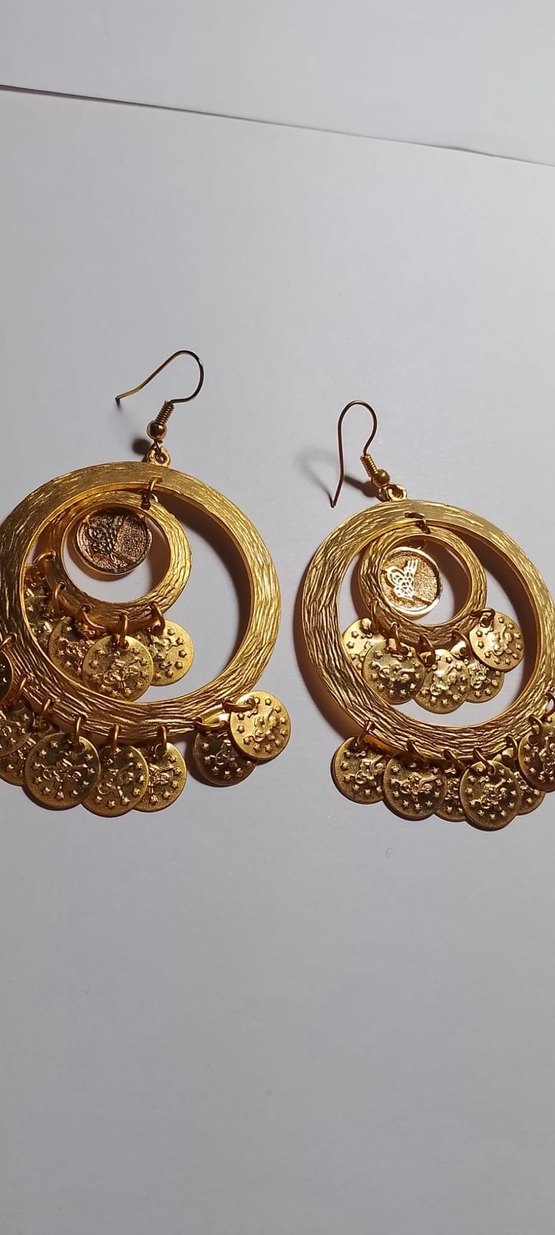 Uzun, boncuklu ve nakışlı detaylara sahip altın renkli bohem tarzda küpeler. Parlak para süslemeleriyle düğünlere uygun. ✨