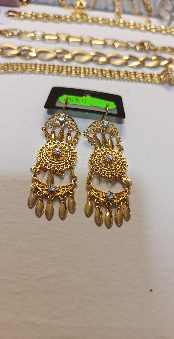 Uzun, altın renkli, işleme detaylı ve renkli boncuk süslemeli bohem tarzda küpe.