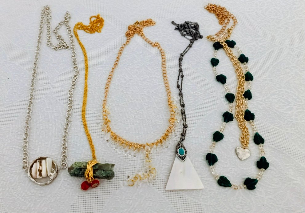 Uzun, altın renkli, boncuklu ve nakış desenli kolye, günlük kullanıma uygun bohem tarzda.