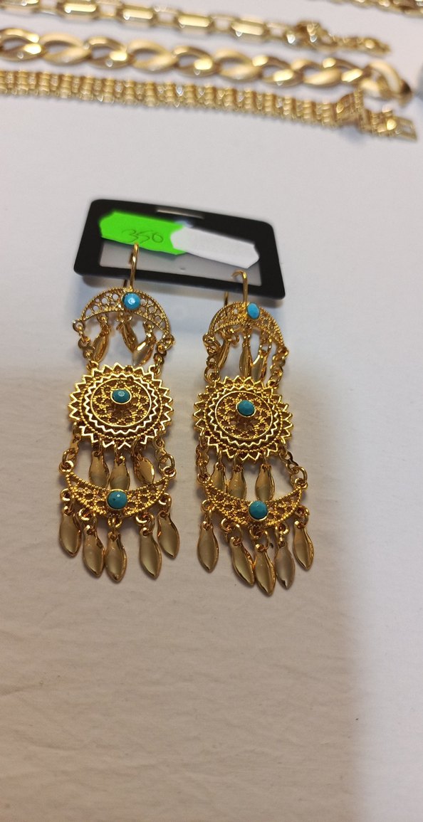 Uzun, altın renkli, boncuklu ve etnik desenli küpeler, bohem tarz ve düğünler için uygundur.