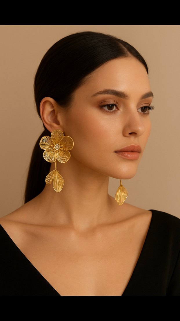Uzun, parlak altın renginde, çiçek desenli ve Telkari tarzında küpeler. Ortasında parlakp boncuk bulunmaktadır. VIP üründür kararma yapmaz. Şık yerler ve özel geceler için uygundur.