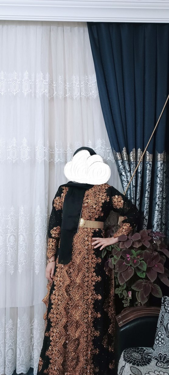 Uzun, bol kesim kadın bindallısı, yüksek yakalı ve askılı kolludur. Koyu altın etnik desenli, drapeli detaylara sahiptir, düğünler için uygundur.