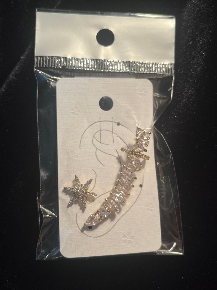 Payetli ve baskılı desenli uzun altın renkli küpe. Günlük kullanıma uygun, ışıltılı ve bohem tarzda.