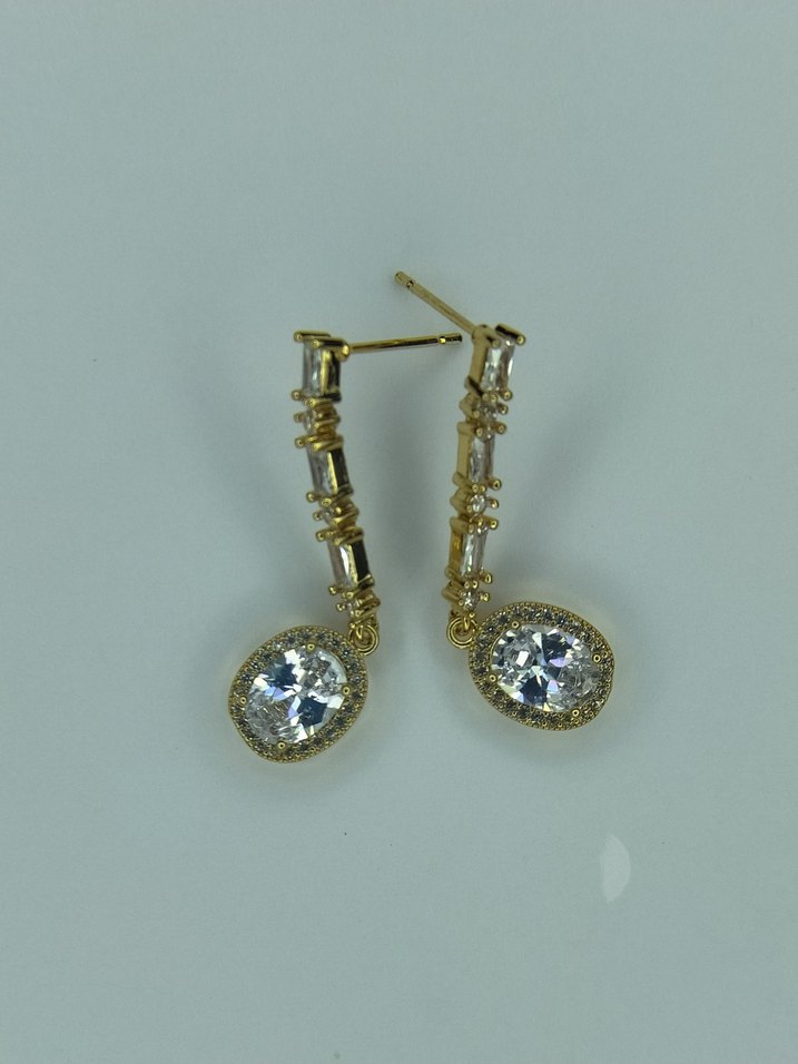 Uzun, altın renkli, zirkon taşlı ve işlemeli detaylara sahip, düğünler için uygun şık küpe. ✨