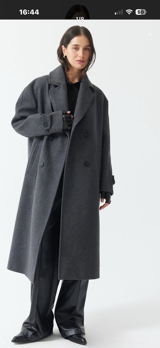 Çift düğmeli, geniş yakalı ve düğmeli manşetlere sahip uzun antrasit gri kaban, kalın ve sıcak kumaştan üretilmiştir. Süpürhe kuması değildir yumuşacıktır