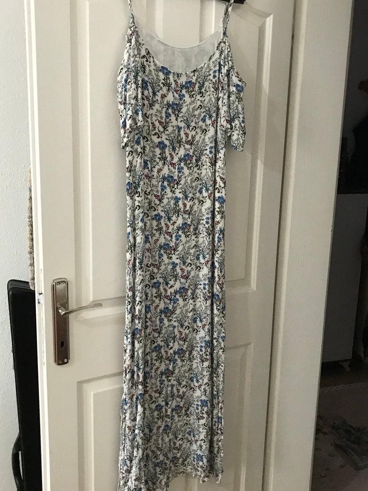 Askılı, uzun bohem elbise, bol kesim ve drapeli tasarıma sahiptir. Çok renkli çiçek desenli ve sentetik kumaştandır, günlük kullanıma uygundur.
