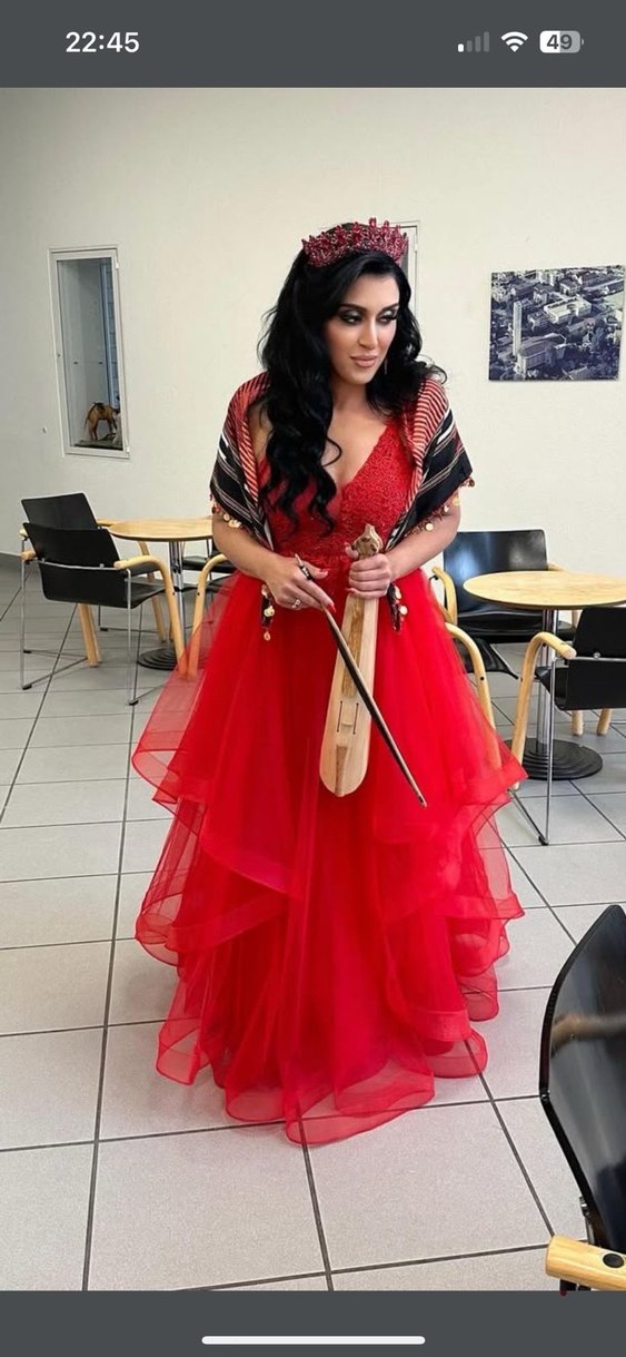 Askılı, straplez, etnik desenli parlak kırmızı uzun elbise, drapeli ve vücuda oturan kesimle düğünler için avant-garde tarzda. Kınalık 40 beden elbise