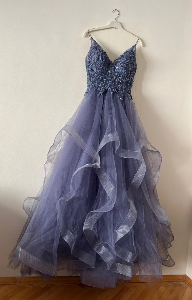 Uzun Askılı Mor Dantelli Fırfırlı Abiye Elbise