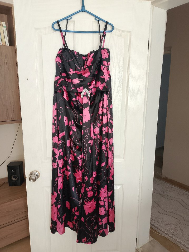 Uzun, askılı ve straplez yaka tasarımlı, bol kesim elbise. Koyu pembe ve siyah bağlama desenli, drapeli detaylara sahip, parti için uygun.
