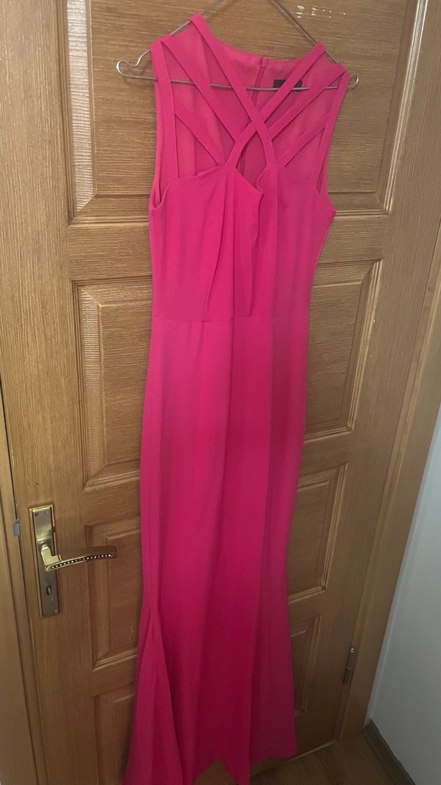 Bu uzun pembe abiye elbise, v yaka ve askılı tasarımıyla fit kesime sahiptir. Dökümlü detaylarıyla çağdaş bir görünüm sunar, romantik akşamlar için uygundur.