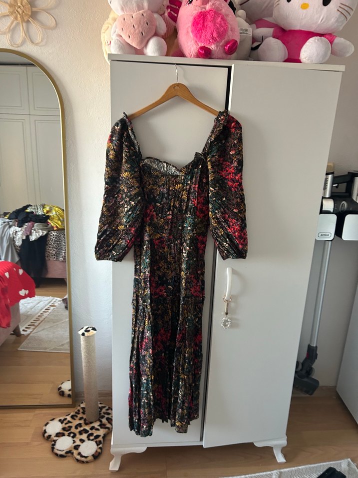 Uzun, bol kesim elbise, straplez yaka, drapeli ve askılı kollar, koyu çok renkli batik desenli, romantik akşamlar için uygun.