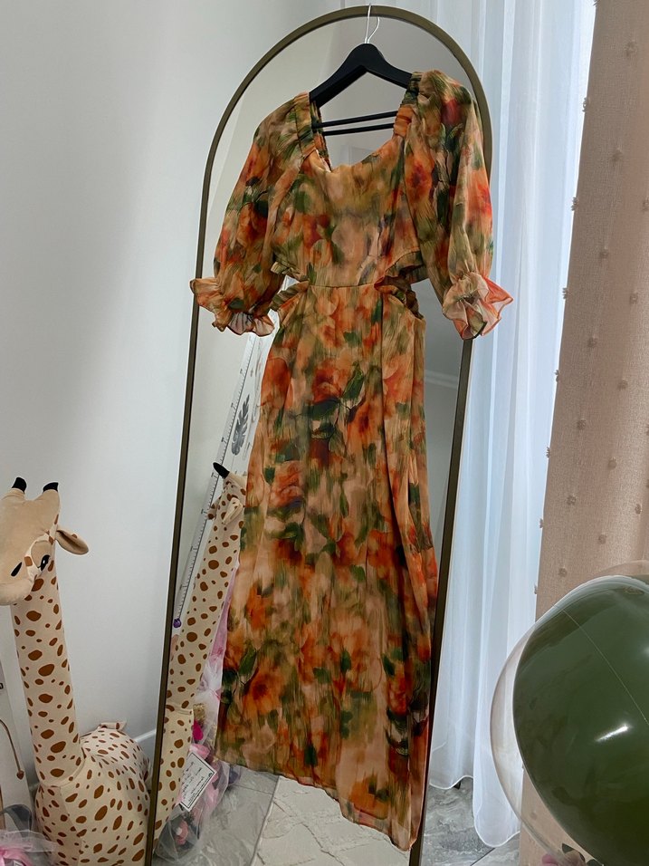 Uzun ve bol kesim bohem elbise, çok renkli tie-dye deseni ve şeffaf sentetik kumaştan yapılmıştır. Straplez yaka ve askılı kollara sahiptir, günlük kullanım için uygundur.