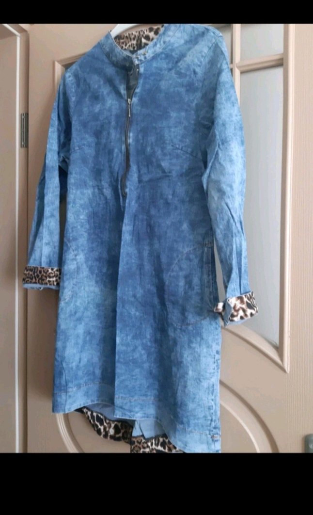 Uzun, bol kesim denim ceket, bağcıklı ve düğmeli detaylara sahip. Uzun kollu, yakalı ve manşet ile etekte leopar desenli süslemeler bulunur.
