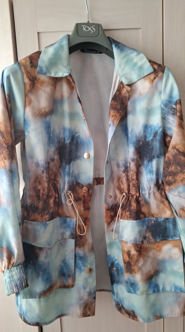 Uzun, bol kesim kadın ceket, parlak mavi batik desenli, düğmeli ve bağcıklı. İpek gibi kumaştan, yakası kesik ve askılı kollu, Paris sokak modasına uygun.