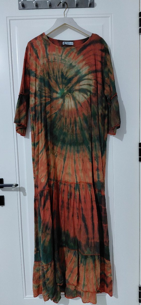 Uzun, bol kesim elbise, koyu renkli çok renkli bağlama deseni ve drapeli tasarıma sahiptir. Kısa kollu ve kayık yaka, yumuşak tekstil kumaştan yapılmıştır. Marka temsilidir.