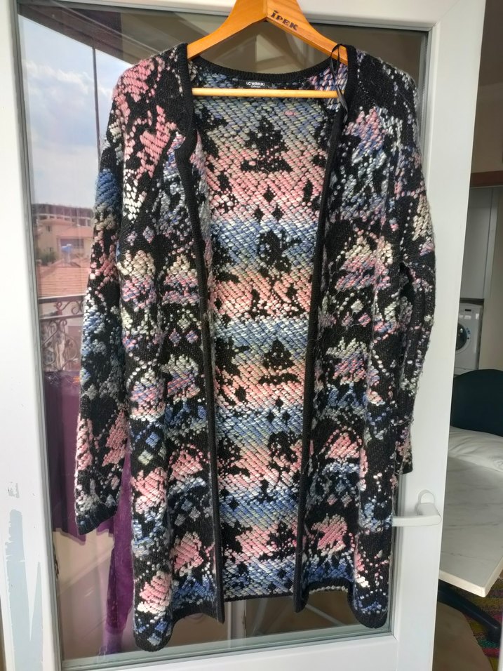 Uzun, örme yapıda ve bağlama desenli çok renkli koyu tonlarda bohem tarzda, bol kesim ve yakası kesik detaylı, uzun kollu hırka.