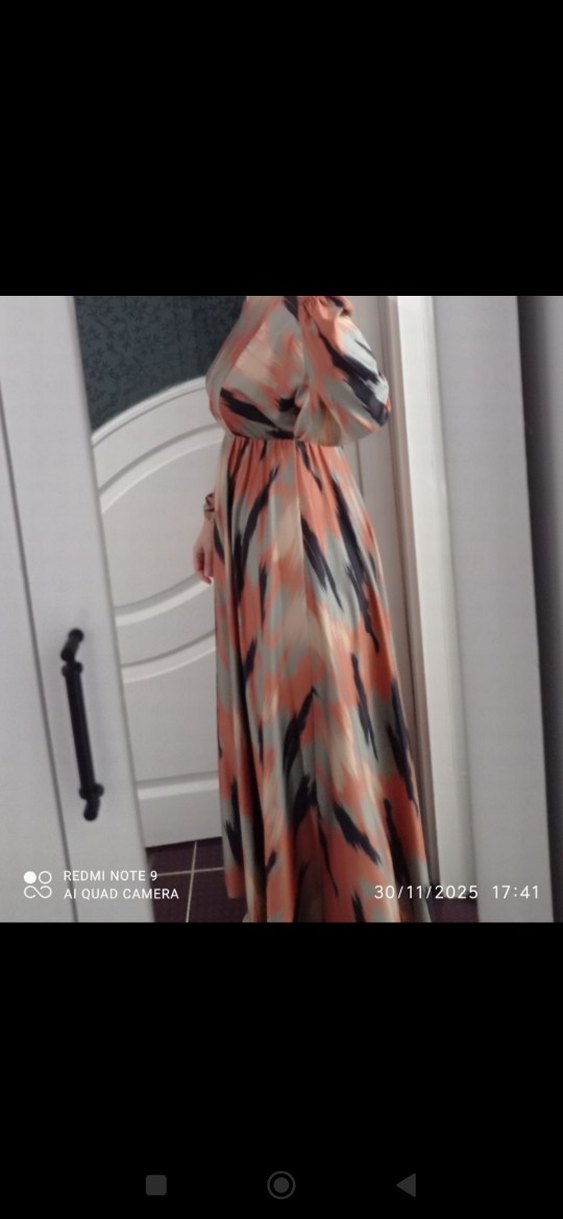 Kadınlar için uzun, bol kesim ve drapeli elbise. V yakalı, uzun kollu, koyu renkli çok renkli bağlama deseniyle, sentetik kumaştan yapılmıştır. Günlük kullanıma uygun, mütevazı ve bohem tarzda.