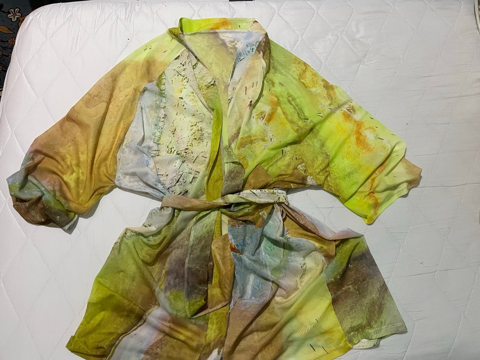 Uzun ve bol kesim olan bu kadın kimonosu, hafif yeşil batik desenli ipeksi kumaştan yapılmıştır.