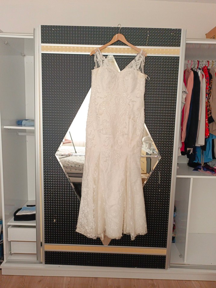 ebru renkte, askılı ve straplez yakalı uzun A-line gelinlik. Modern klasik tarzda, vintage detaylara sahip, normal kesim.
