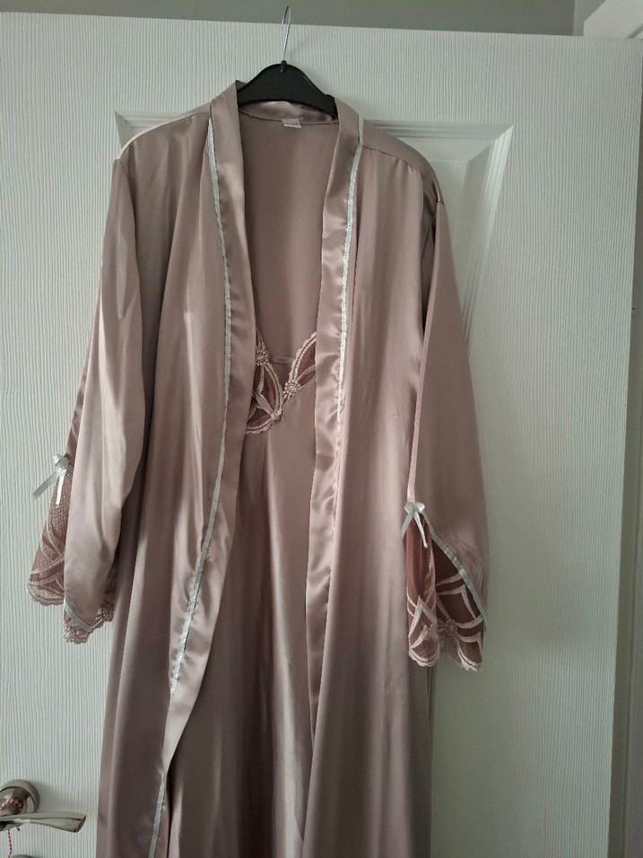 Kadınlar için uzun bej gecelik ve dantel detaylı, bohem sabahlık takımı. Rahat ve şık bir uyku zamanı kombini. hiç giyilmedi bohça icin almıştım yıllardır duruyor.