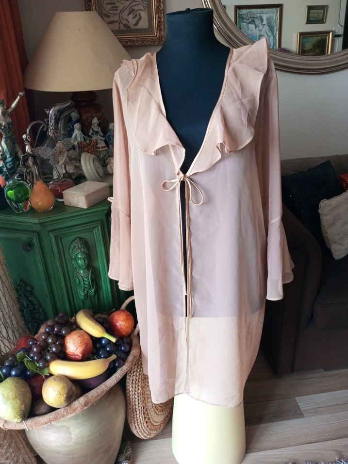 Uzun kollu, bol kesim bej sabahlık, pastel tonlu ve fırfırlı yakaya sahip, bağcıklı kapanışlıdır. Paris esintili bohem tarzını yansıtır. Plajda mayo ustunede kullanabilirsiniz