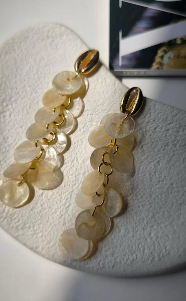 Parlak, boncuklu disklere sahip uzun bej küpeler. Bohem tarzında, gösterişli düğünler için uygun.