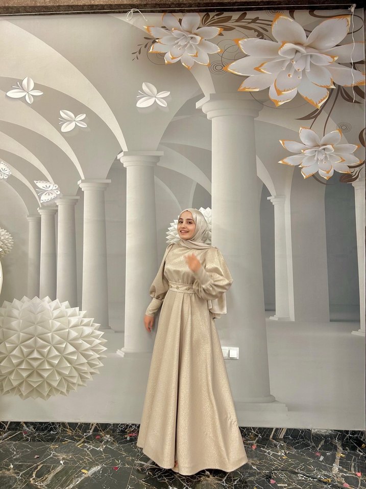 Uzun bej renkli, yüksek yakalı ve uzun kollu, drape detaylı, bol kesim tesettür abiye, sade ve şık, düğünler için uygun. Gamze yakar dikim