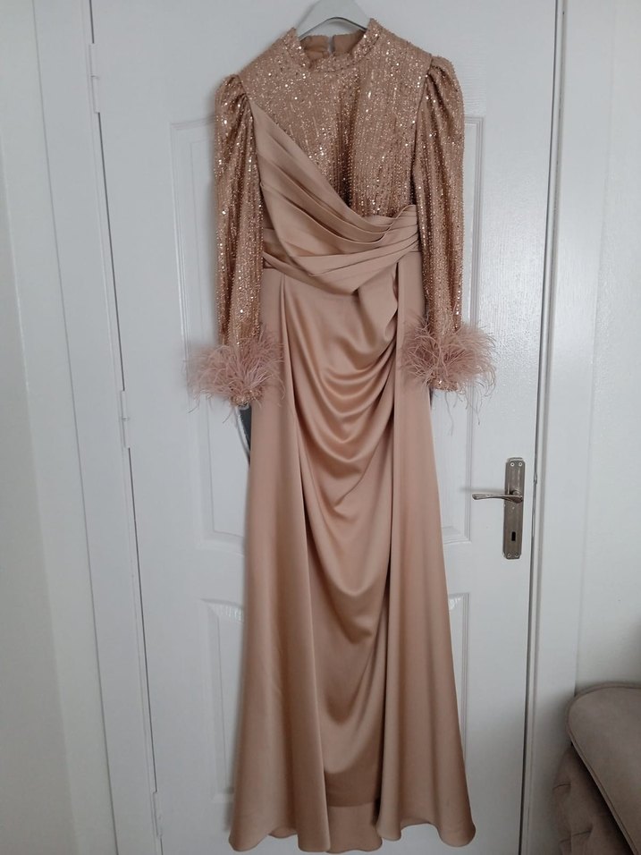 Uzun bej renkli, drapeli ve parlak kumaşlı abiye elbise, uzun kollu ve tüy detaylı manşetlere sahip, düğün için uygun şık kesim.