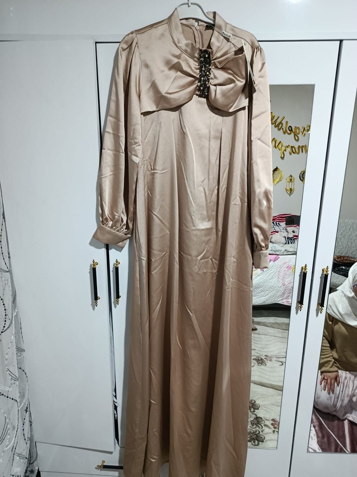 Uzun, parlak bej renkte, drapeli tasarıma sahip, uzun kollu ve halter yakalı, bol kesim kadın abiye elbise. Düğün ve özel günler için uygundur. ✨