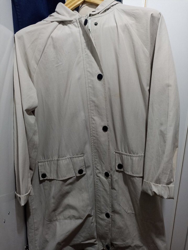 Bej renkli, düğmeli, uzun kollu, keten kumaştan midi uzunlukta rahat kesim kadın yağmurluk. ️
