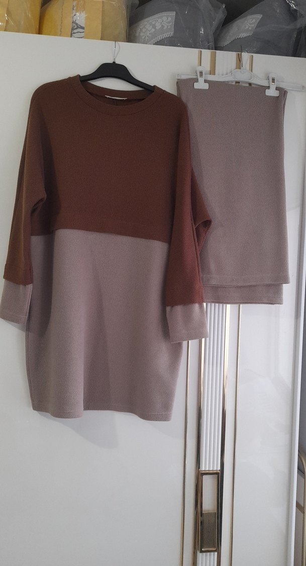 Kadınlar için uzun ve bol kesim, bisiklet yaka triko kazak. Bej ve gri tonlarında, sentetik kumaştan örülmüş, rahat ve çağdaş tarzda, günlük kullanıma uygun. ikili takım
