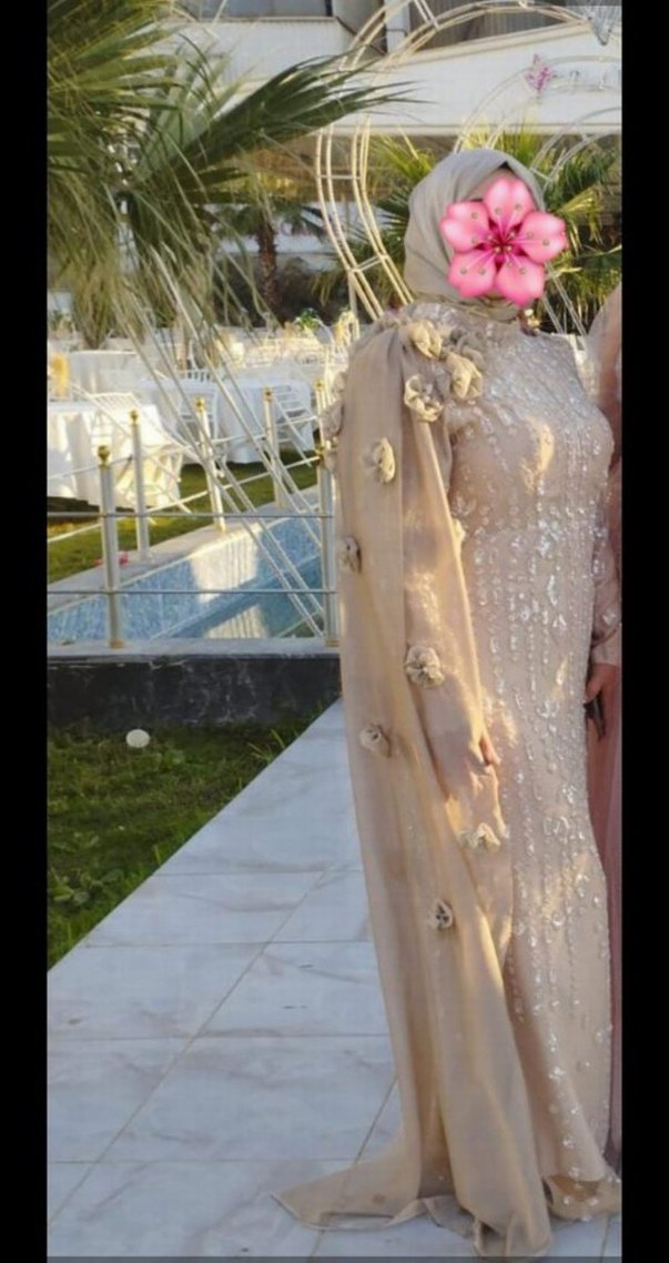 Uzun, dar kesim nişan elbisesi yüksek yakalı ve uzun kolludur. Bej renkli işlemeli kumaşı çiçek detaylı drapelerle süslenmiştir. 40-42-44 bedene kadar olur arkası iplidir satılıktır.