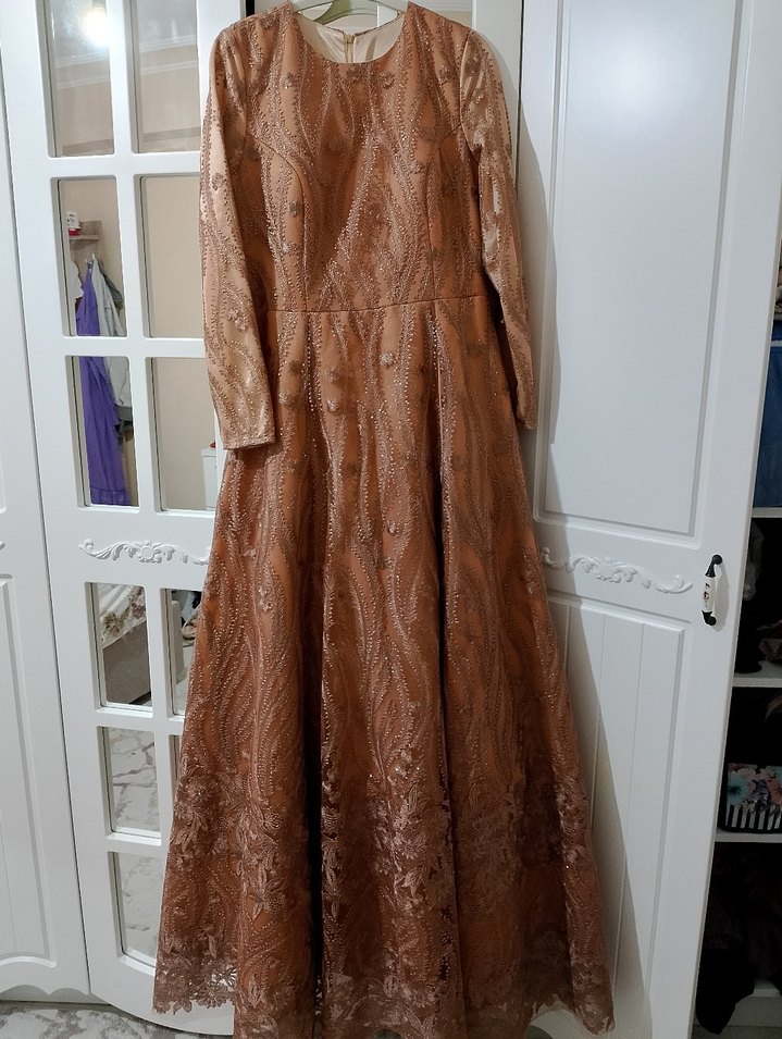 Uzun boy bej renkli, parlak işlemeli desenli, tekne yaka ve uzun kollu kadın henna elbisesi. Düzenli kesim ve drapeli stilde, düğünler için uygun.