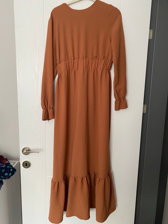 Uzun kollu, yuvarlak yakalı bej elbise, etek ve kol uçlarında fırfır detaylıdır. Salaş kesimi ve sentetik dokusu minimalist ve bohem tarzı yansıtır.