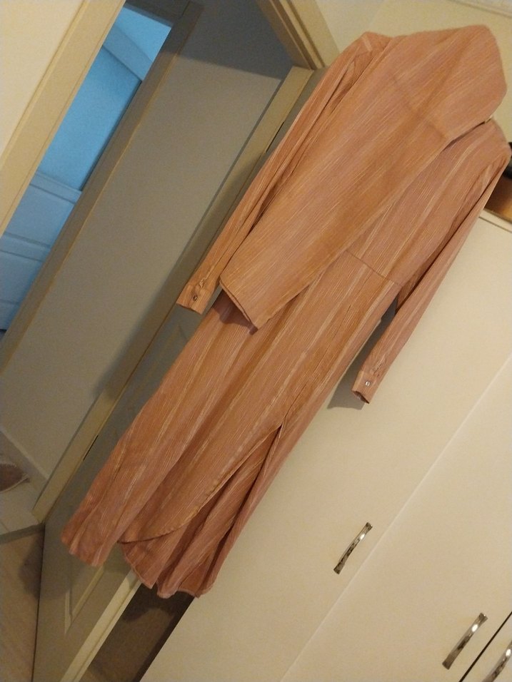 Uzun, parlak bej renkte, uzun kollu ve regular fit kadın kimono elbise. Minimalist bohem tarzıyla sade ve şık görünüme sahiptir.