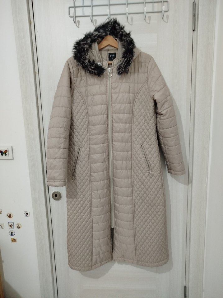 Kürk detaylı kapüşonlu uzun bej kadın kışlık mont. Dikişli deseni, regular fit ve uzun kolludur. Yumuşak sentetik kumaştan, günlük kullanıma uygundur. ❄️ üzerinde 46 beden yazıyor ama dar kalıptır 42 beden için idealdir.