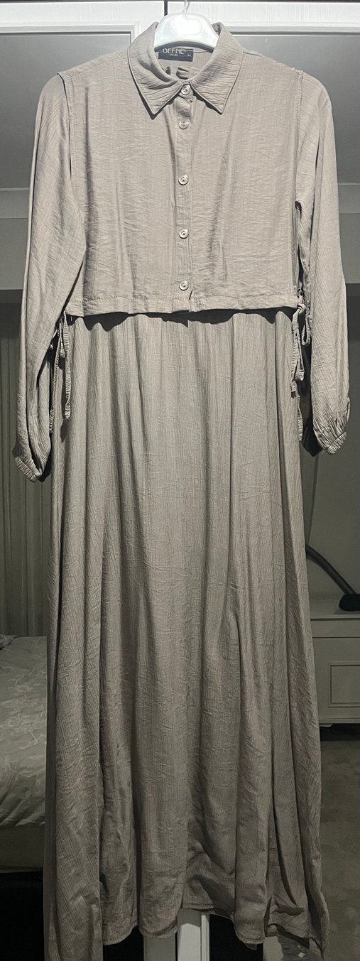 Bohem tarzda, uzun ve bol kesim bej keten elbise. Drapeli, kayık yaka ve askılı kollara sahip, günlük kullanıma uygun.