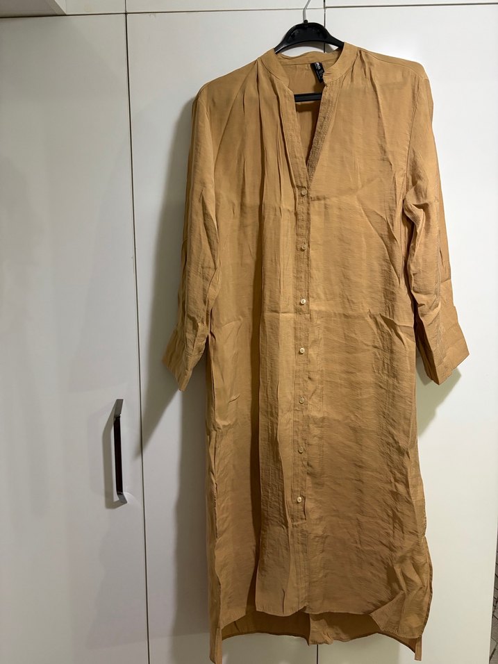 Uzun, bej renkli keten tunik, bol kesim, uzun kollu ve V yakalıdır. Düğmeli ön kısmı ve sade, minimalist bohem tarzıyla günlük kullanıma uygundur.