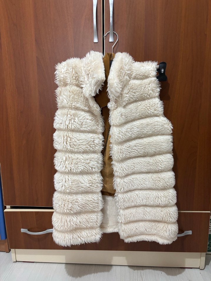 Uzun, bej renkli kadın yelek, yumuşak kürk detayları ve straplez kesimiyle rahat ve şık bir görünüm sunar. Kolsuz ve desensiz, günlük kullanıma uygundur.