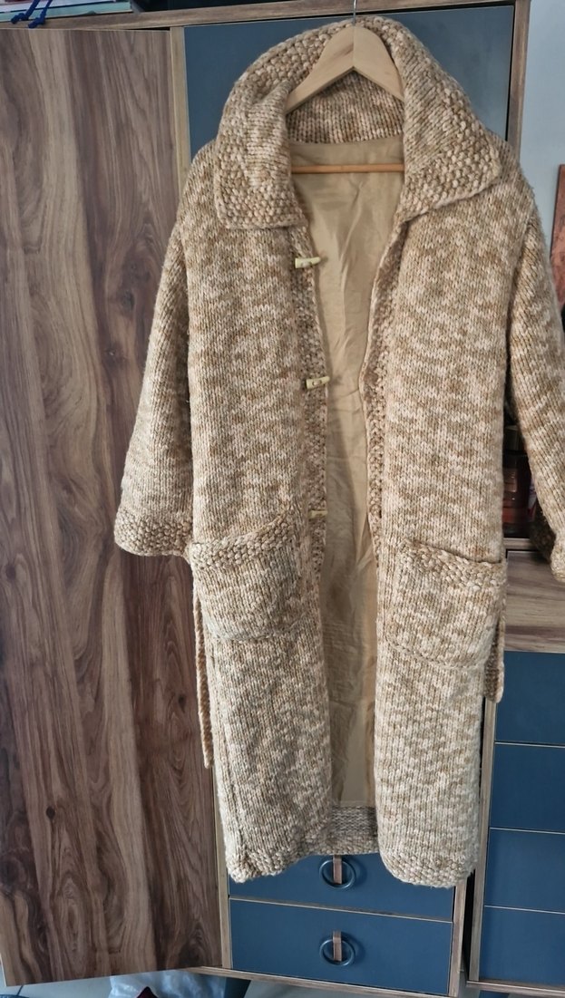 Uzun, bol kesim, bej renkli örgü kadın kaban. Notlu yaka ve uzun kolludur, büyük cepleri günlük kullanım için uygundur. Desensiz, rahat ve bohem tarzda. el örgüsü içi astarlı 100 de 100 yün ipden örüldü boy 108 2 göyüs arası 58