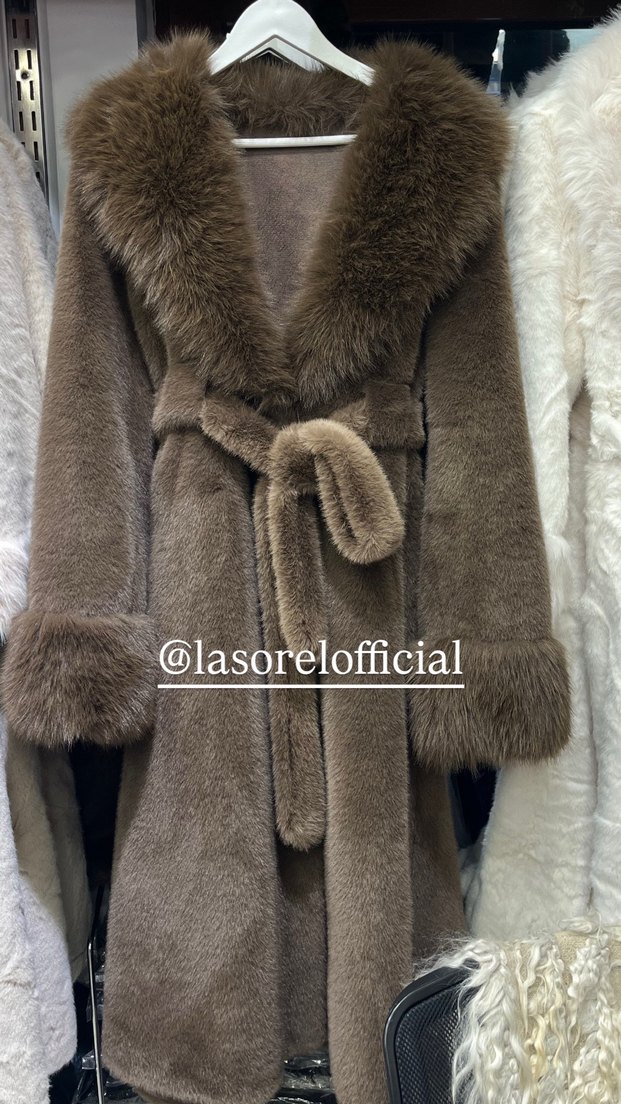Uzun Bej Süet Kürk Detaylı Kadın Kaban