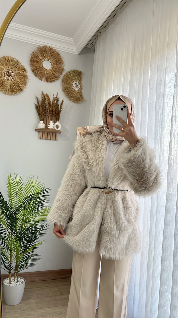 Uzun bej renkte, suni kürkten yapılmış, bol kesim ve kesik yaka detaylı ceket. Yumuşak dokulu, düz desensiz, günlük kullanıma uygun.